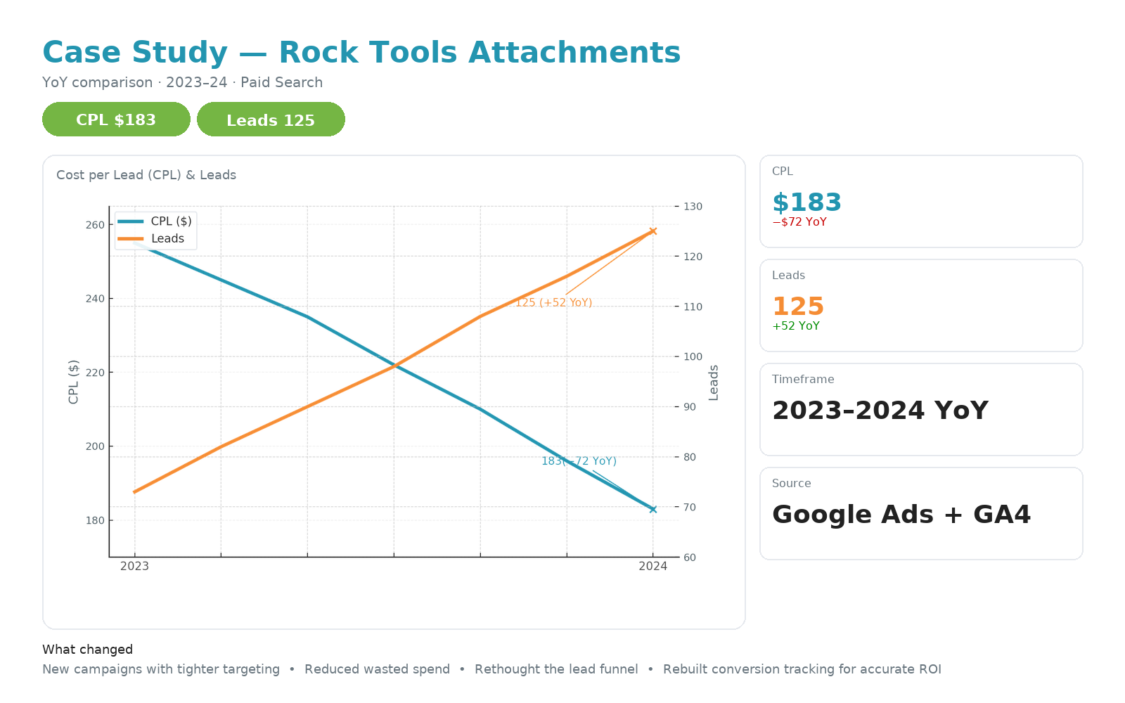 We rebuilt targeting, fixed tracking, and tuned the funnel—lower CPL, more qualified leads, no extra spend.